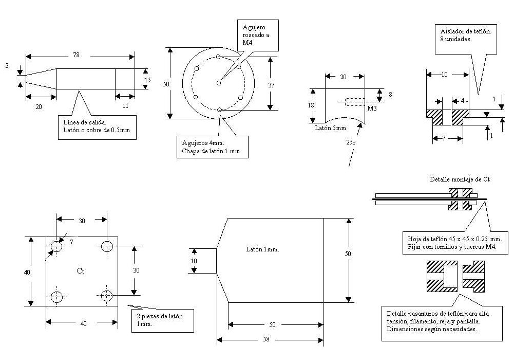 R1 : 4 resistencias de 10R / 1W en paralelo, soldadas a plaquita de latón según dibujos.