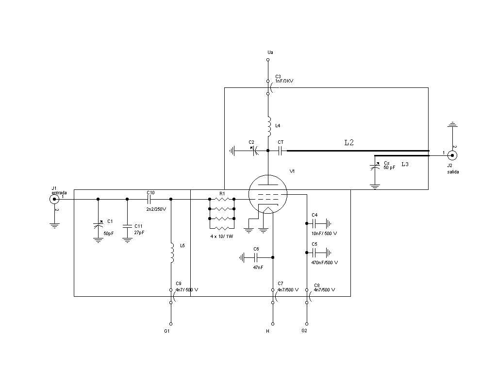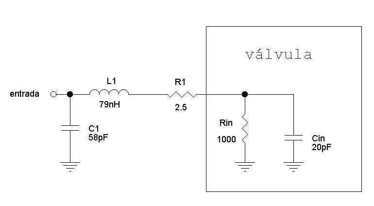 Nuestro amplificador se desarrolla entorno a una válvula tetrodo 4CX250B ó R en configuración de cátodo a masa. El circuito de entrada de la lámpara se puede representar por una capacidad de unos 20 pF en paralelo con una resistencia de unos 1000R , tal y como se observa en la figura 1. Dicha resistencia es variable en función del voltaje de la rejilla de control y de la corriente de placa. Por esta razón, si tratamos de hacer una adaptación de bajas pérdidas dará lugar a que la impedancia de entrada del amplificador dependa de la potencia de excitación, lo que podría ocasionar distorsión en el excitador y por lo tanto "splatter".