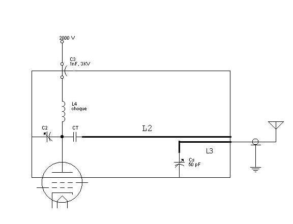 El circuito de salida es muy simple, una línea de acoplo en serie con un condensador variable de aire realizan la adaptación. Este acoplo permite adaptar las diferentes impedancias de salida de la válvula entre ciertos límites, para permitir la operación en modo AB1, es decir , sin corriente de reja en SSB para buena linealidad, o en clase AB2 para CW o FM donde la linealidad no es importante y podemos alcanzar una mayor potencia de salida.