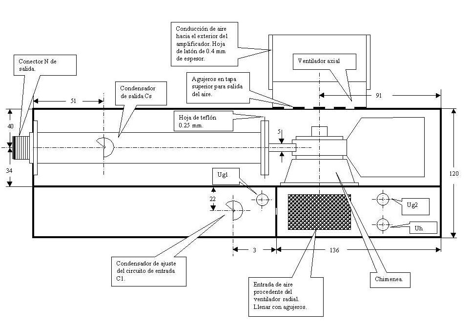 Para adaptar la impedancia de salida de la lámpara a nuestra antena, y al mismo tiempo obtener un cierto filtrado, utilizaremos una línea coaxial constituida por un tubo de latón, encerrada dentro de una cavidad también de este mismo material. Esta disposición proporciona un rendimiento elevado, con muy bajas pérdidas . Usaremos una línea de 1/4 de onda en lugar de una de 1/2 onda, debido a que su tamaño resultaría excesivo. Como condensador de sintonía utilizaremos uno casero realizado a partir de un disco de latón y una varilla roscada como se describirá más adelante. La alta tensión se aplica a la lámpara a través de un choque y un condensador de desacoplo. La placa se aísla del tubo por medio de un condensador hecho de una fina lámina de teflón entre dos chapas cuadradas de latón.