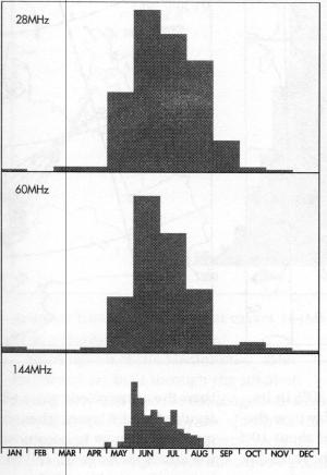 Aunque el fenómeno de la esporádica-E es inherentemente irregular e impredecible, la sucesiva recolección de datos a lo largo de los años indica que ocurre principalmente entre los meses de mayo y agosto , con el máximo en la primera semana de junio.