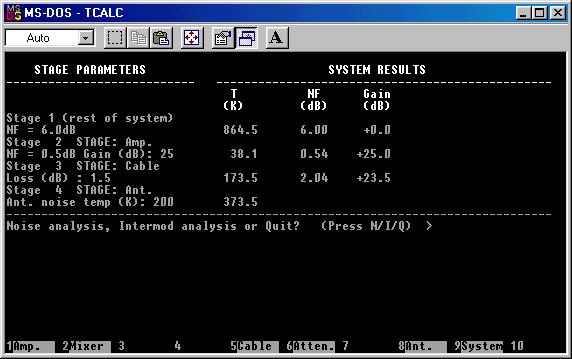 Aprovechando dicho programa y para no aburrirnos con la calculadora, vamos a ver qué diferencia existe entre colocar un preamplificador de bajo ruido en la misma antena o por el contrario hacerlo en el equipo. Supongamos un equipo de 144 MHz con cifra de ruido 6dB, una línea de alimentación coaxial de 1.5dB de atenuación ,un preamplificador con cifra de ruido 0.5dB y ganancia 25 dB, temperatura de antena 200K. La temperatura final resultante del sistema con previo en la antena y con previo en el equipo es de 239.6 K y 373.5 K respectivamente. Es decir, el ruido ha aumentado en casi 2 dB. Igualmente la relación señal/ruido ha empeorado en 2dB, lo que en condiciones de señal débil puede significar recibir o no recibir. Para ver esto de forma práctica, imaginemos que estamos recibiendo vía rebote lunar a una estación que transmite con 2 KW, pero nos llega justo al límite de comprensibilidad con el previo abajo. Si hubiésemos puesto nuestro previo en el tejado bastarían 1260W, ¿ no es un desperdicio de potencia?