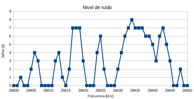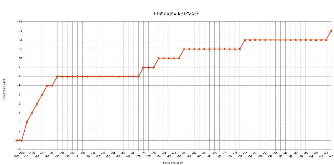 My friend Ricardo, EA4GMZ, has a strong interference in several portions of the HF spectrum. Yesterday he was taking notes about interference levels on 28 MHz band using his Yaesu FT-817. He found out that pressing the IPO button or ATT was mandatory for having a useful curve with diferent strenght levels. If not pressed, interference level values were "compressed around S8". We suspected that FT-817 smeter readings were not linnear.