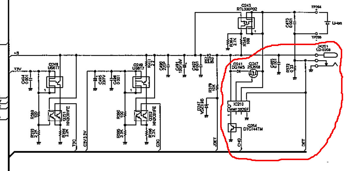 The handheld was working ok so voltage regulators Q248 and Q249 should be ok. It also worked fine from the battery so Q243 bypass should be ok. The failure might be inside the red circle. I also suspected from the DC connector internal switch. I checked it using my resistance meter. 0.33 ohm resistance appeared from negative battery terminal to GND chassis when DC plug was interted.