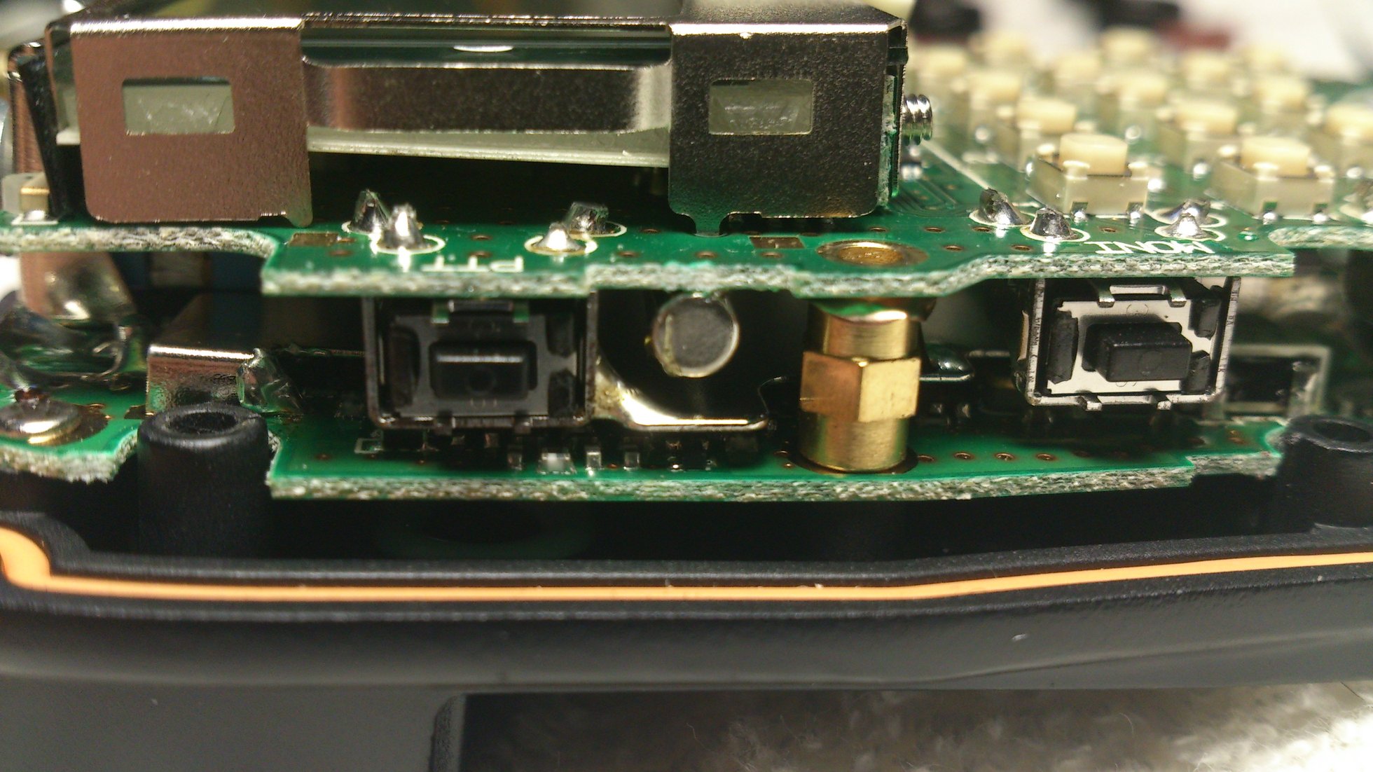 FIGURE 3: TO REMOVE CPU UNIT PCB, THE FIRST ISSUE IS THIS PTT BUTTON SOLDER TO THE SHIELDING METAL.