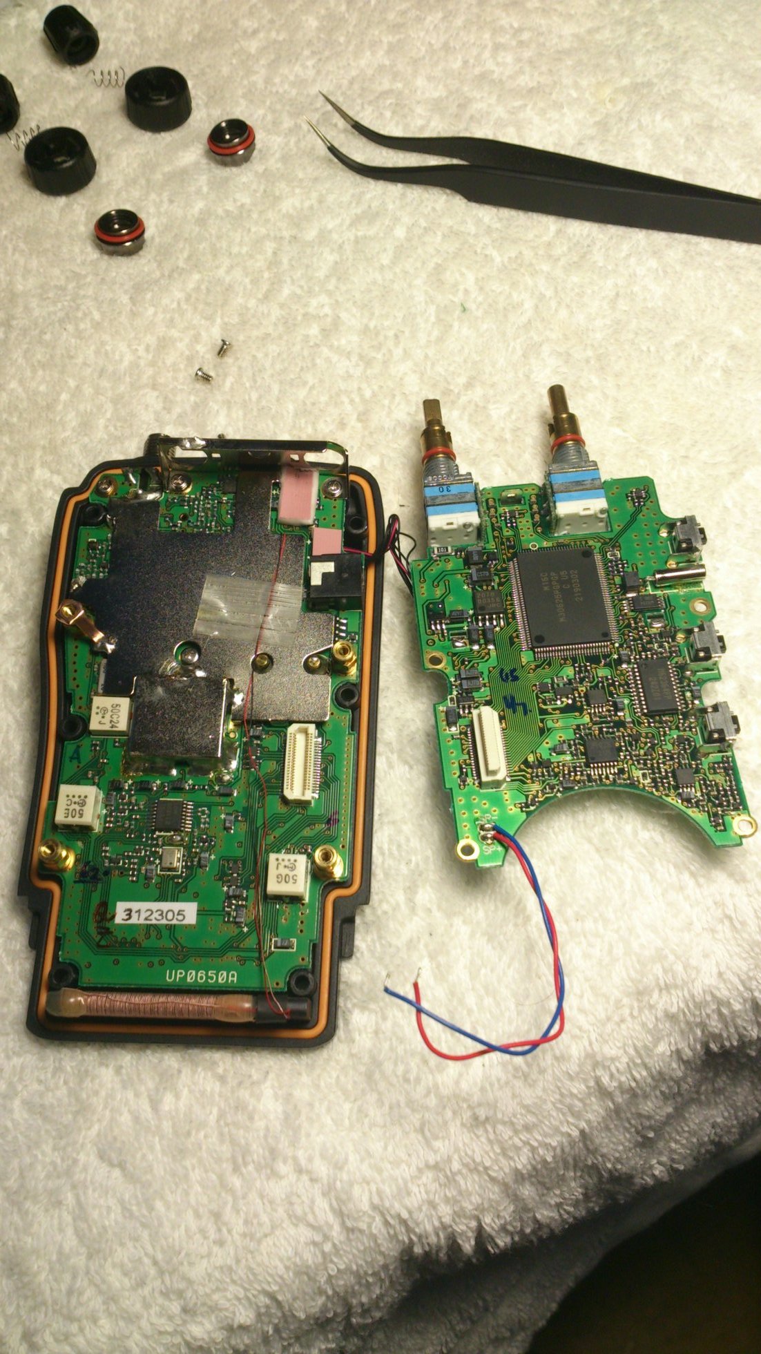 To remove CPU Unit PCB, first remove PTT solder to the shielding metal. Use desoldering braid, flux and a soldering iron. Be careful, do not drop any soldering material below. A little cable that shorts display frame to a metal plate that holds the main and sub dials should also be removed. This can be done with care using a soldering iron and pliers. Do not forget to solder those two points when you assemble the unit again.