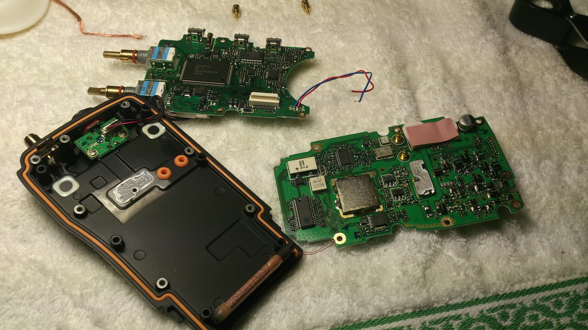 I found a horrible shielding plate soldered at four points to the Main Unit PCB. There is charging circuitry at both sides of PCB. At top side there are several components below the shielding plate, so I needed to remove the plate to see what was going on. Remove all solder at the four points using desoldering braid, flux and a soldering iron as before. Be careful with the bar antenna cables, they are thin and fragile, do not be fooled by the camera magnification . Remove the adhesive tape that holds them before applying heat. Metal plate dissipate heat quickly so you need a powerful soldering iron. I used my gas powered soldering iron.