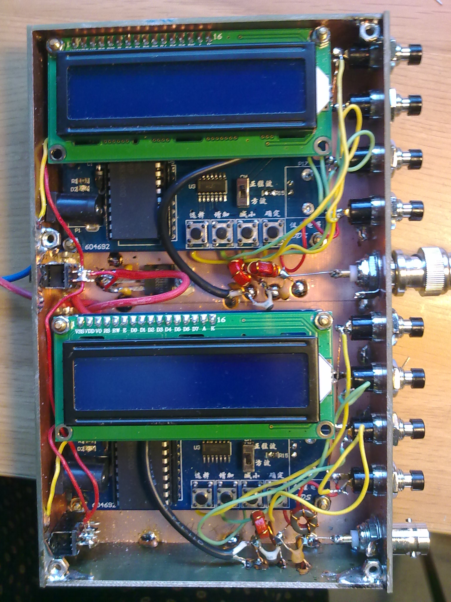 -Two channel signal generator. I use two DDS units that I bought at very low price on Ebay. I modified them for having 50 ohm output impedance and a low pass filter to remove alias signals. I put them in a box and resulted a very handy unit. I will describe the modifications when have free time. Signal level is measured into a Rigol DS1052E 50 MHz BW oscilloscope. So, signal level accuracy depends on this measurement.