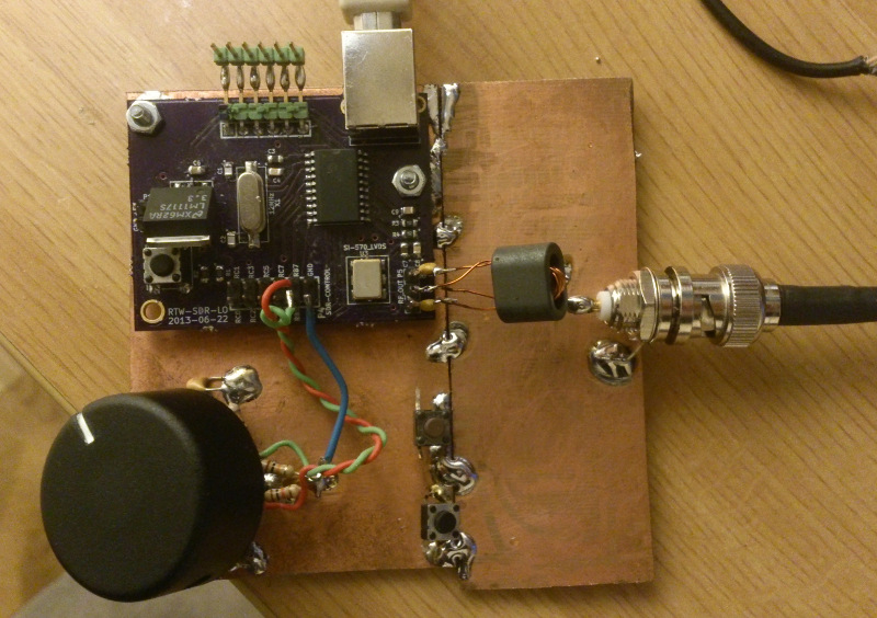 FIGURE1: RTW-SDR-LOCALOSC BOARD WITH TRIFILAR OUTPUT TRANSFORMER TO A BNC CONNECTOR.
