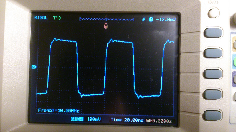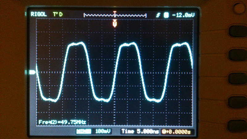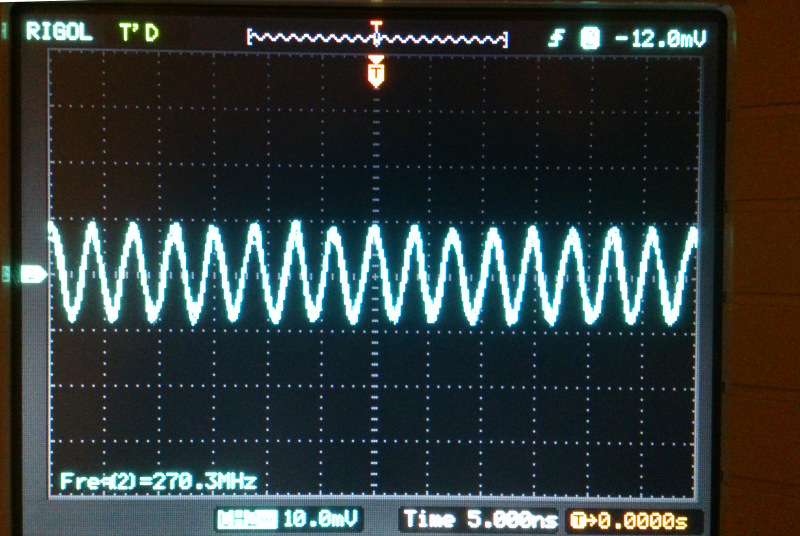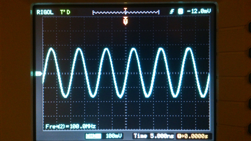 My oscilloscope has a 50 MHz bandwidth. The 100 MHz signal has a false sinusoidal appearance due to the limited bandwidth. I can see the signal at the maximum 280 MHz frequency but strongly attenuated, as you see in the oscilloscope screenshots.