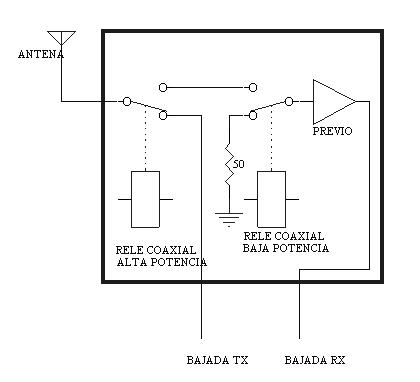 Cuando las potencias son muy elevadas y el aislamiento del relé principal de potencia no es suficiente se añade un pequeño relé de aislamiento que conecta una resistencia de 50W a la entrada del preamplificador durante la transmisión. En caso de tener una sola bajada de cable coaxial se podría añadir un tercer relé de alta potencia.