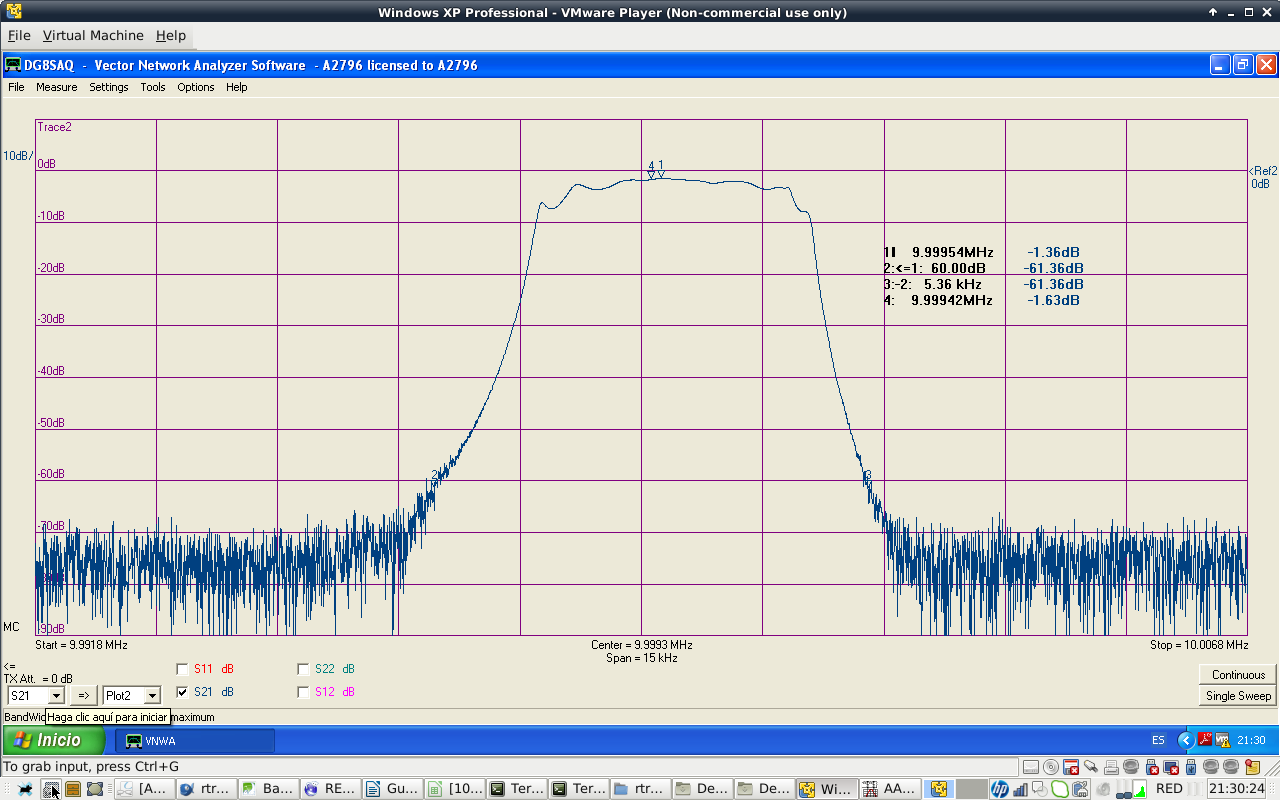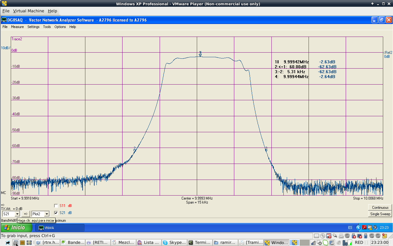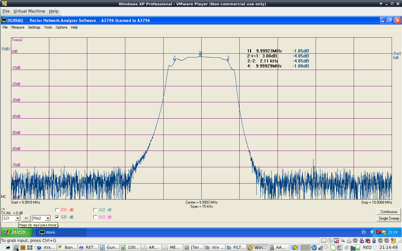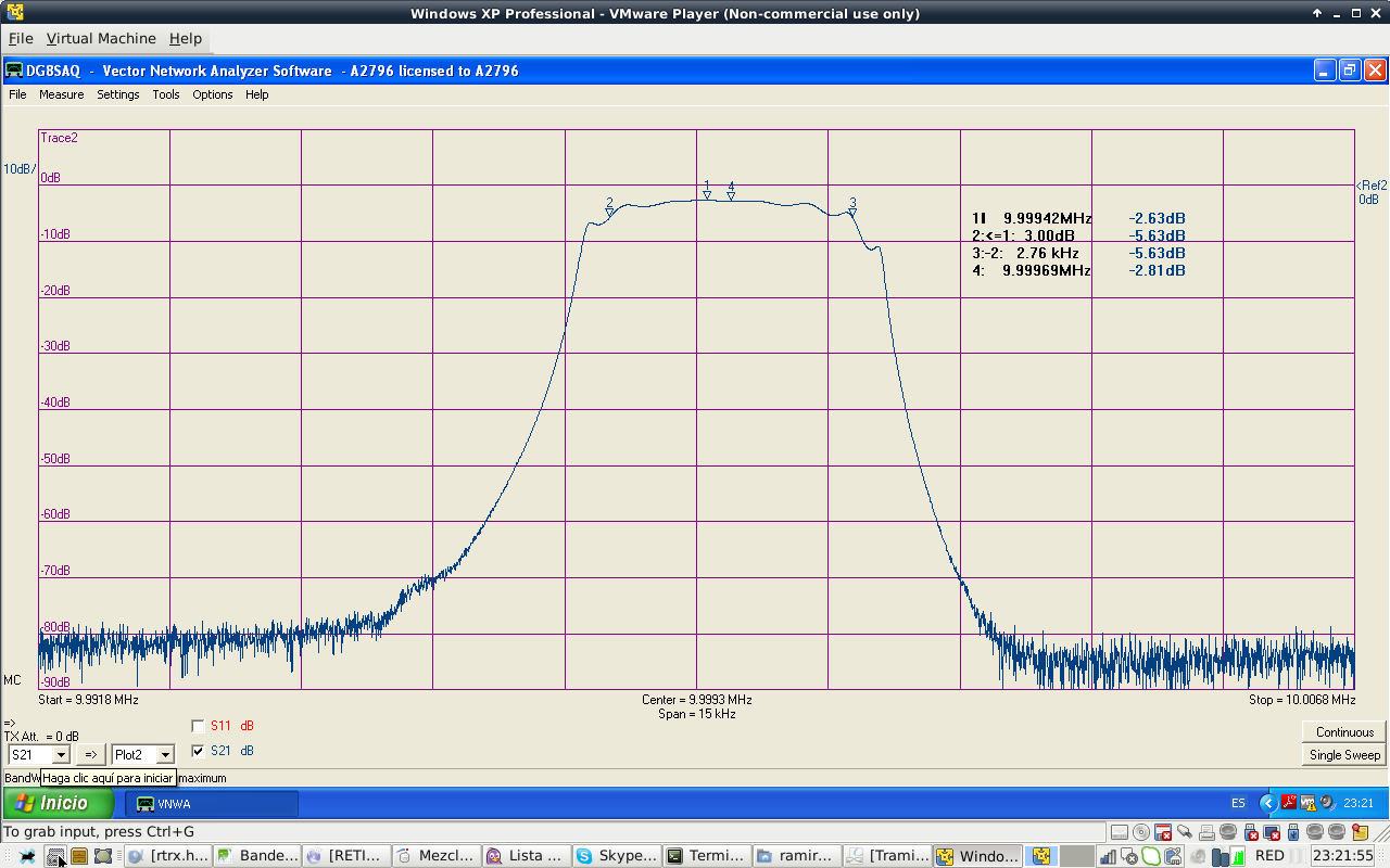 Filter shape is similar to the calculated values. Filter attenuation at passband center is 1.85 dB. Filter BW is 2.1 kHz at -3 dB, a bit narrow. I do not particulary like ripple shape of Cohn filters. Passband has that ripple shape at high order filters. Anyway, they are easy to build.