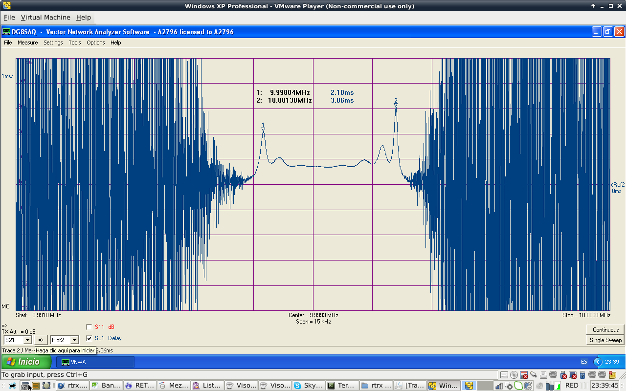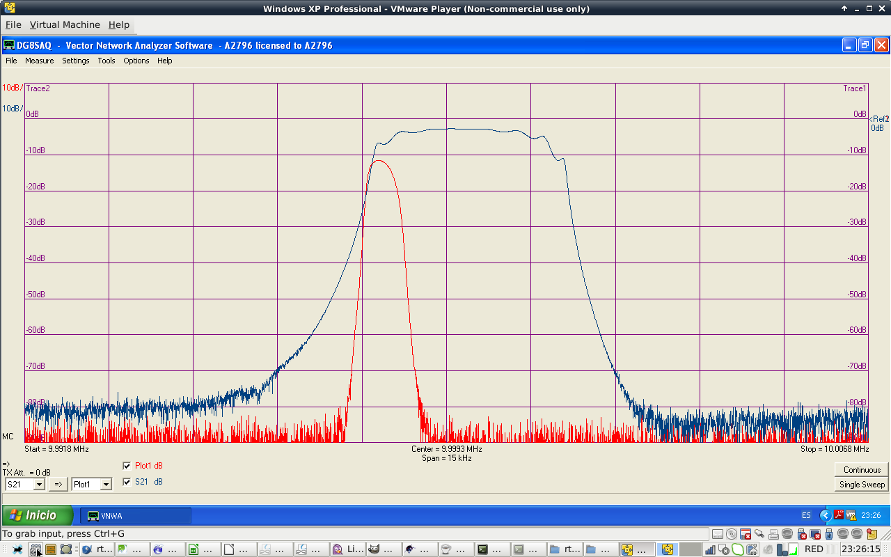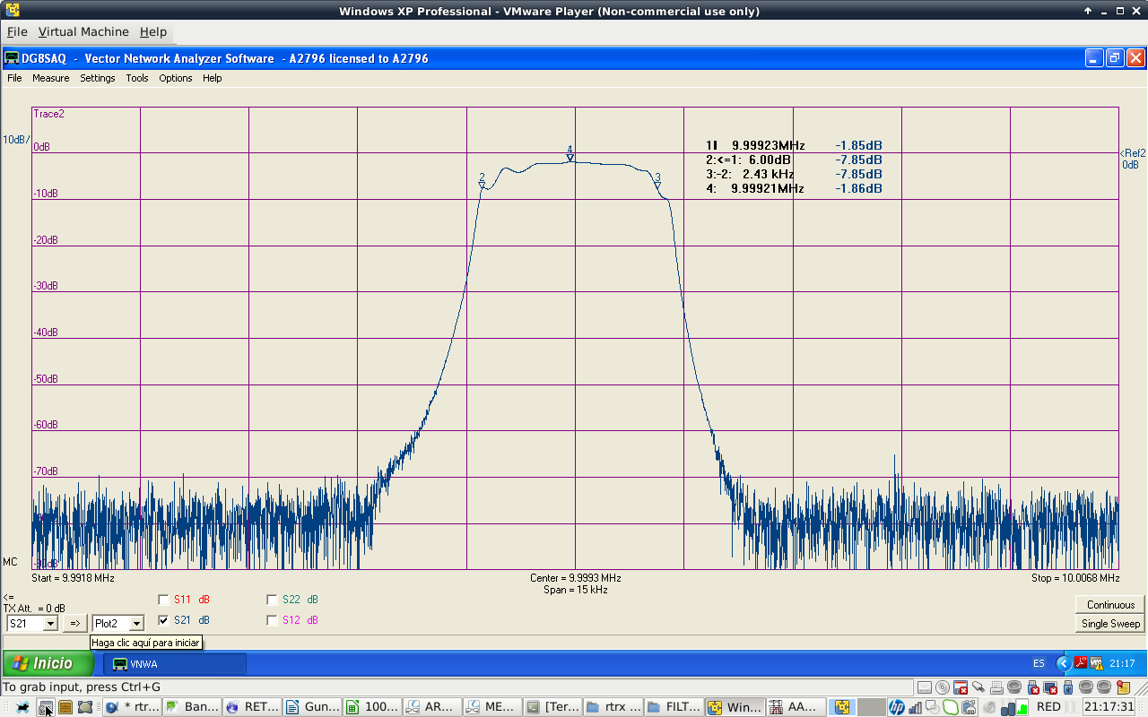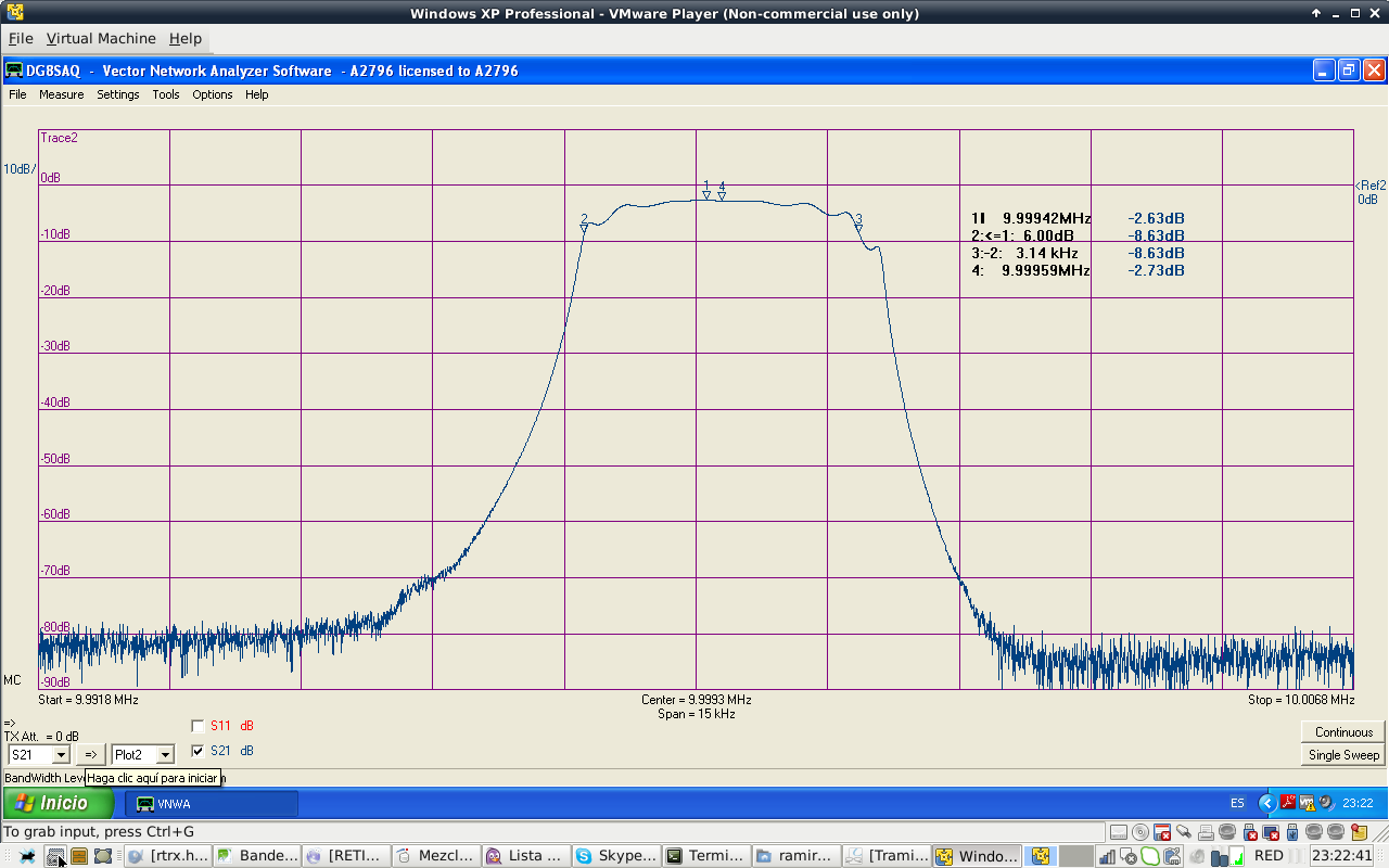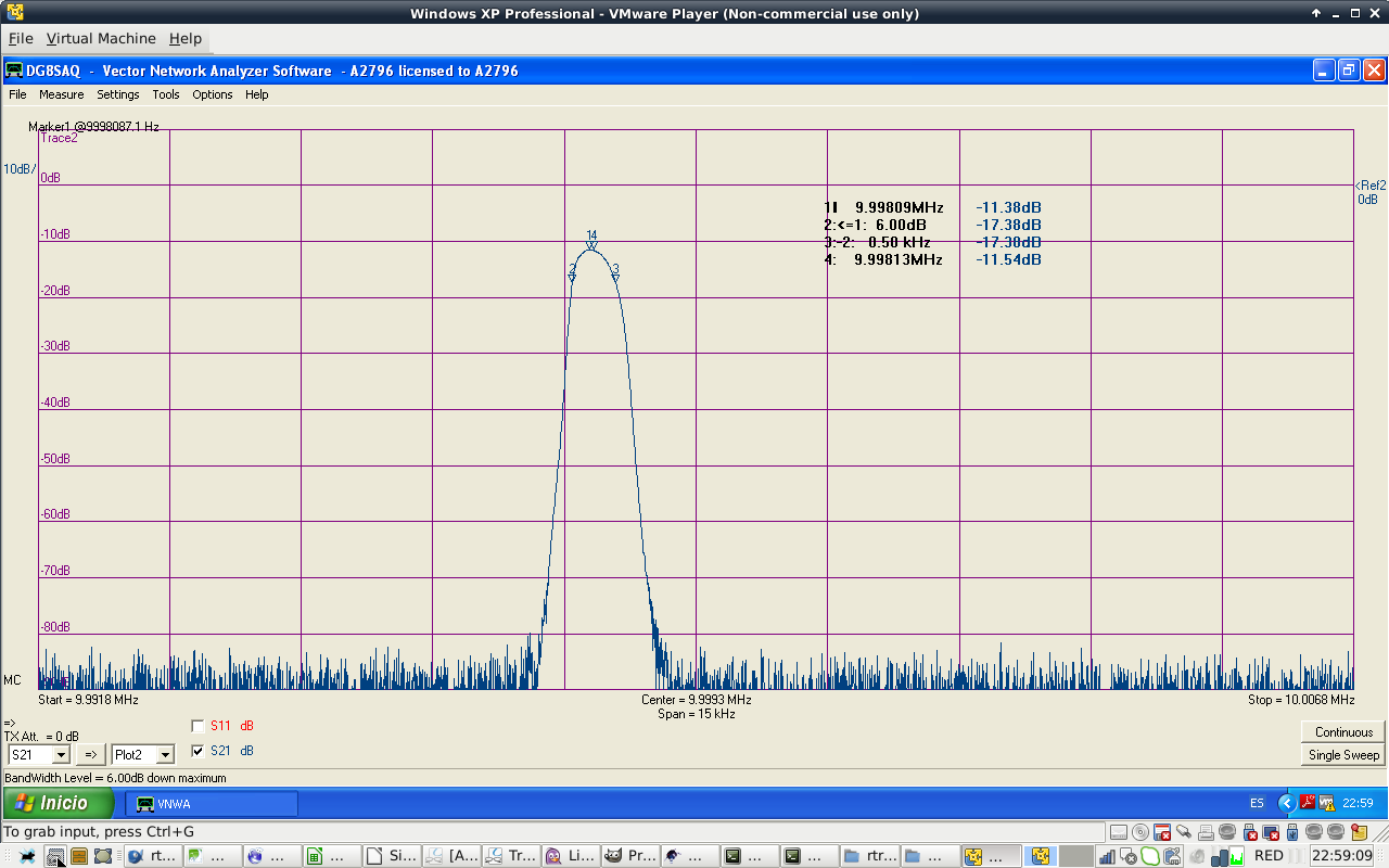 Filter shape is similar to the calculated values. Filter attenuation at passband center is 1.85 dB. Filter BW is 2.1 kHz at -3 dB, a bit narrow. I do not particulary like ripple shape of Cohn filters. Passband has that ripple shape at high order filters. Anyway, they are easy to build.