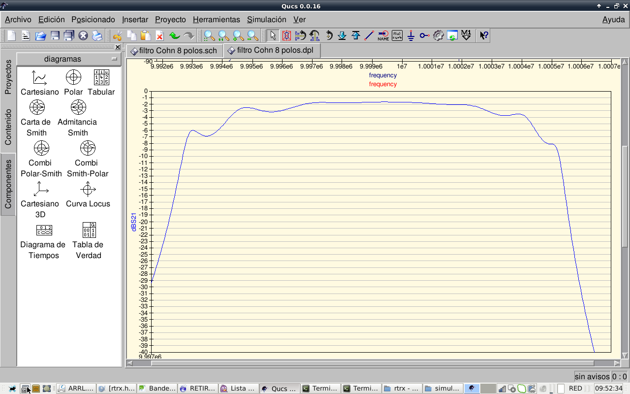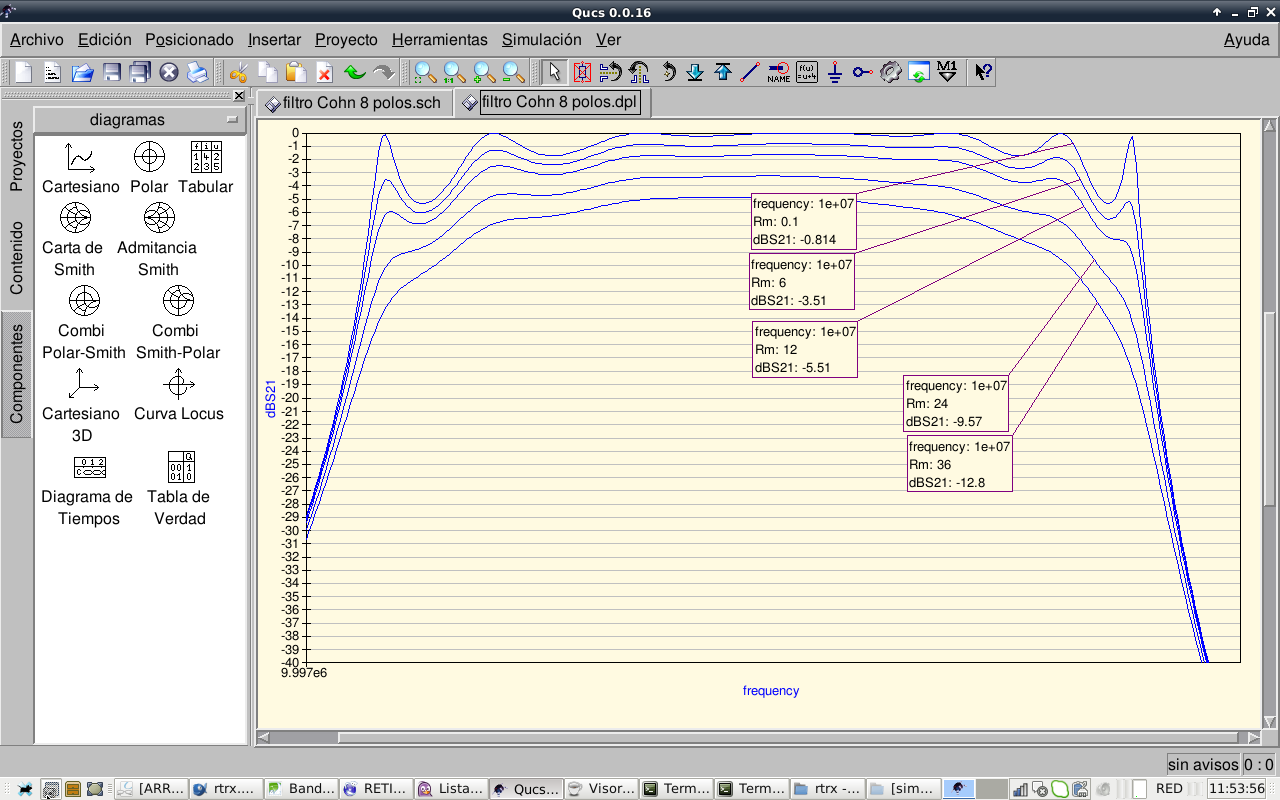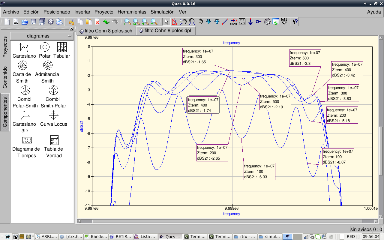 So, after this experiments we conclude that the 8 pole Cohn filter cannot be improved further, it works as is. Other kinds of better passband shape filters like Chebychev will be investigated. Now I take a rest with filters.…this filter, as is now, should work reasonably well. I will continue with other receiver stages.