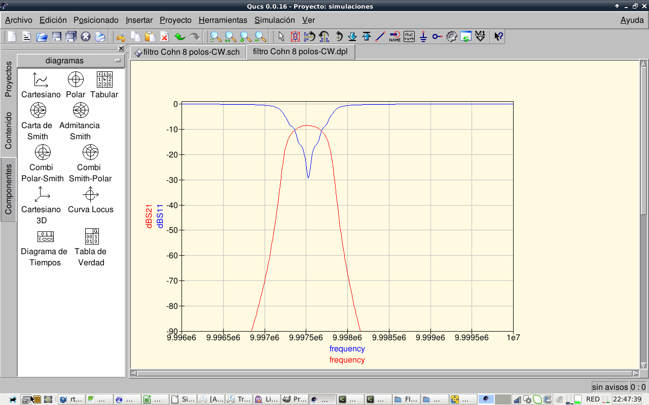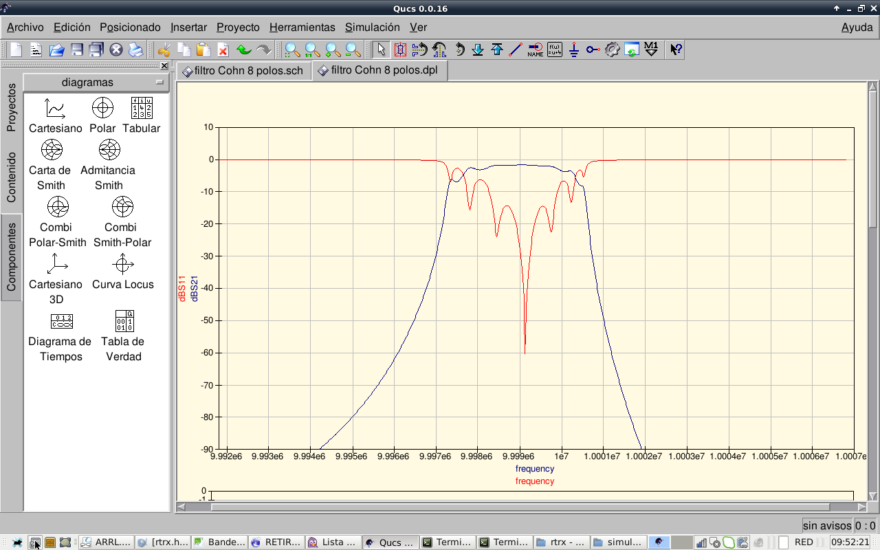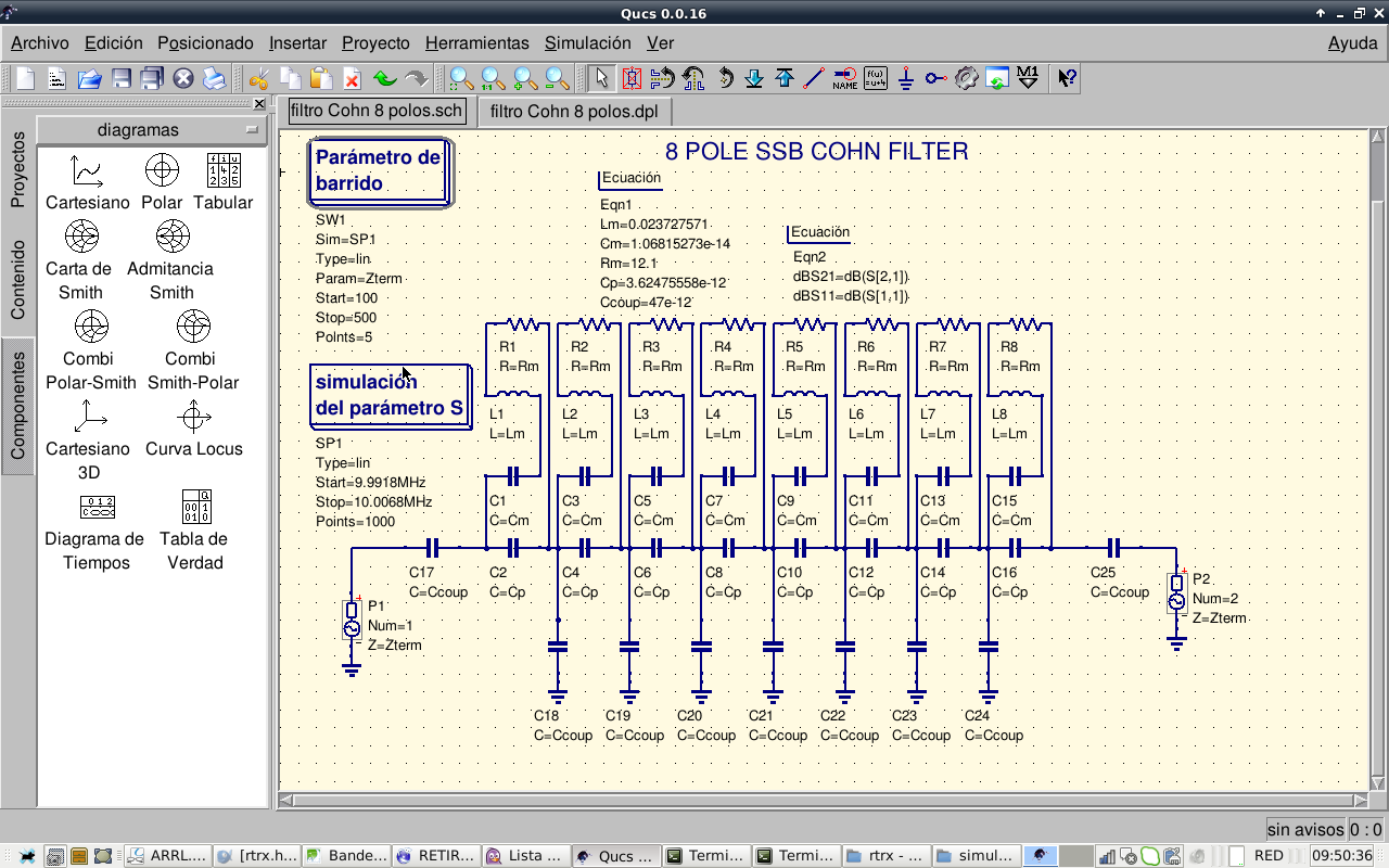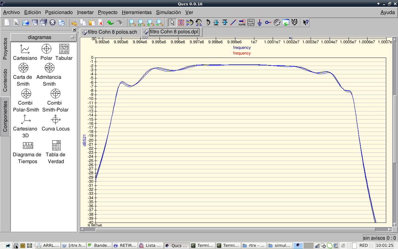 So, after this experiments we conclude that the 8 pole Cohn filter cannot be improved further, it works as is. Other kinds of better passband shape filters like Chebychev will be investigated. Now I take a rest with filters.…this filter, as is now, should work reasonably well. I will continue with other receiver stages.