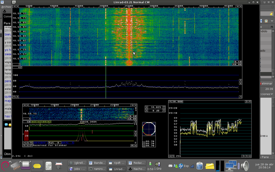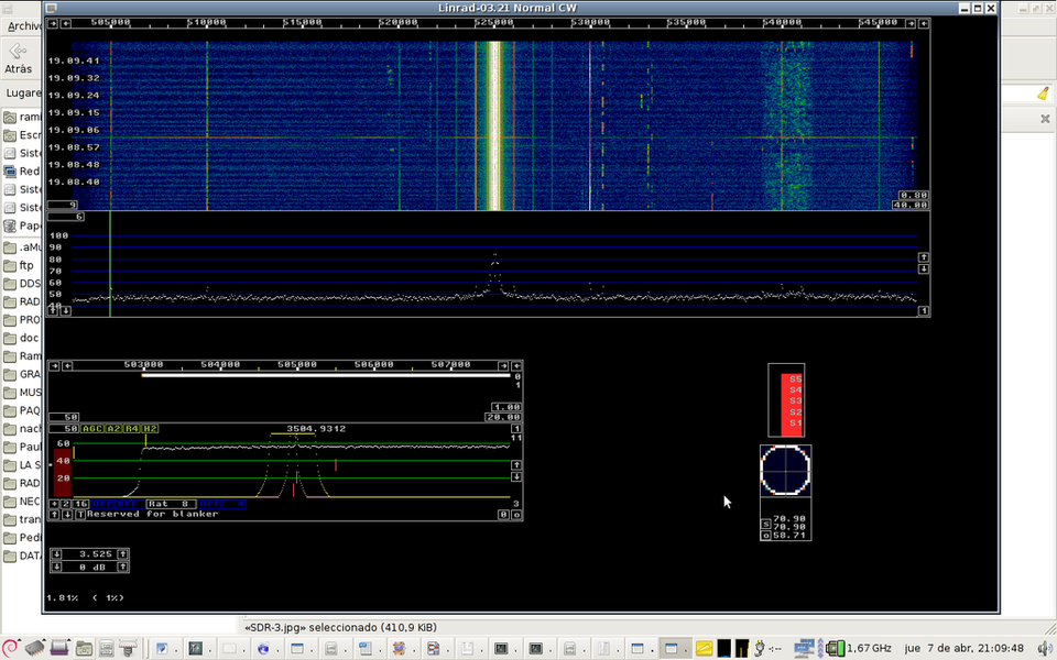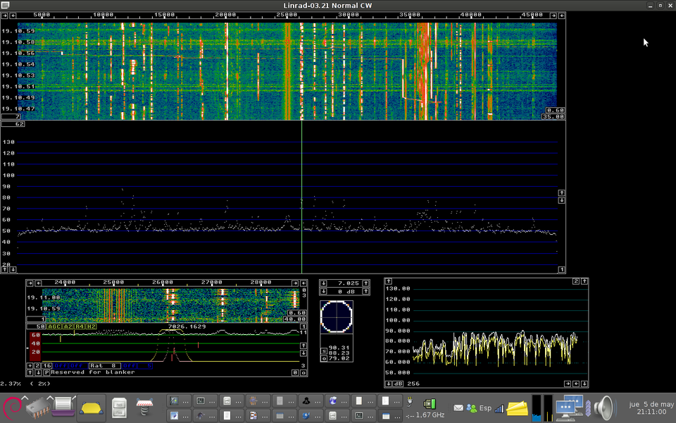 In the last picture you can see the waterfall on the CW segment on 80 m band. Also you can see strong 50 Hz hamonics on the center of the screen and carriers spaced 1 kHz. Theese carriers are generated into the laptop dirty power supply. In the next picture you can see a cleaner waterfall. A strong 200 km range station, EA1FAQ is tuned in CW mode. Bandwidth is about 500 Hz.