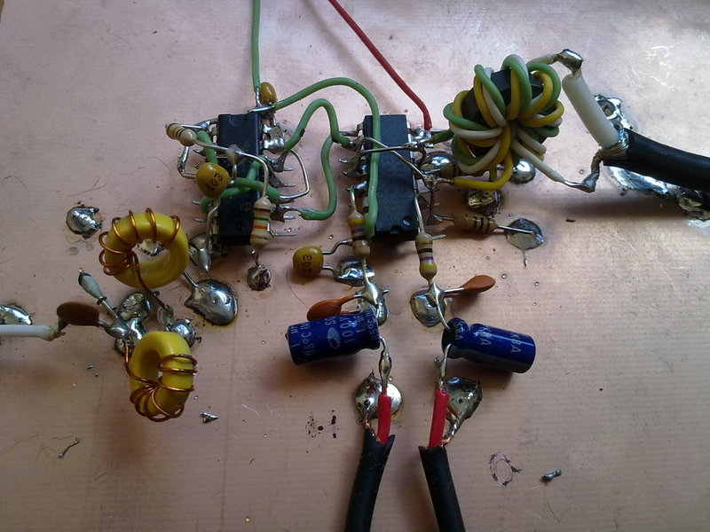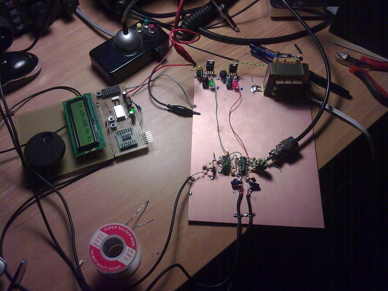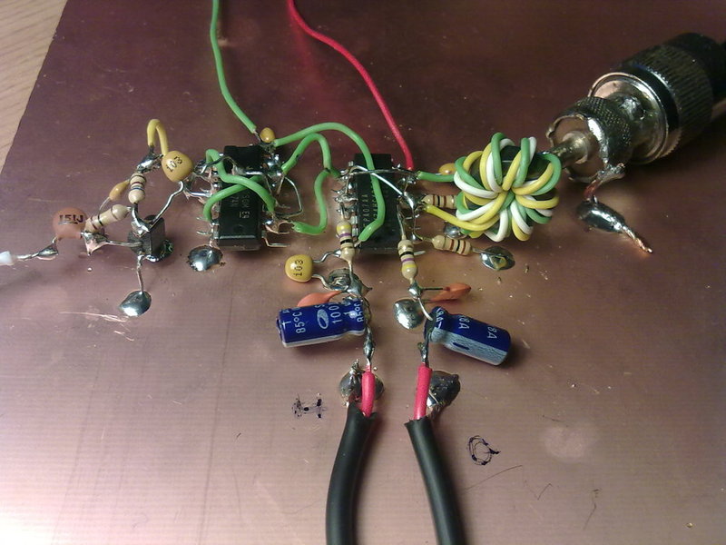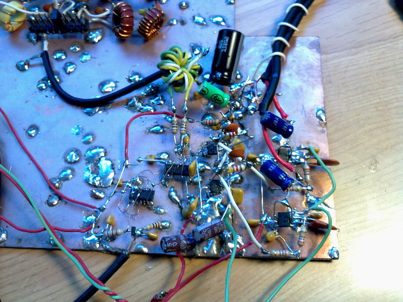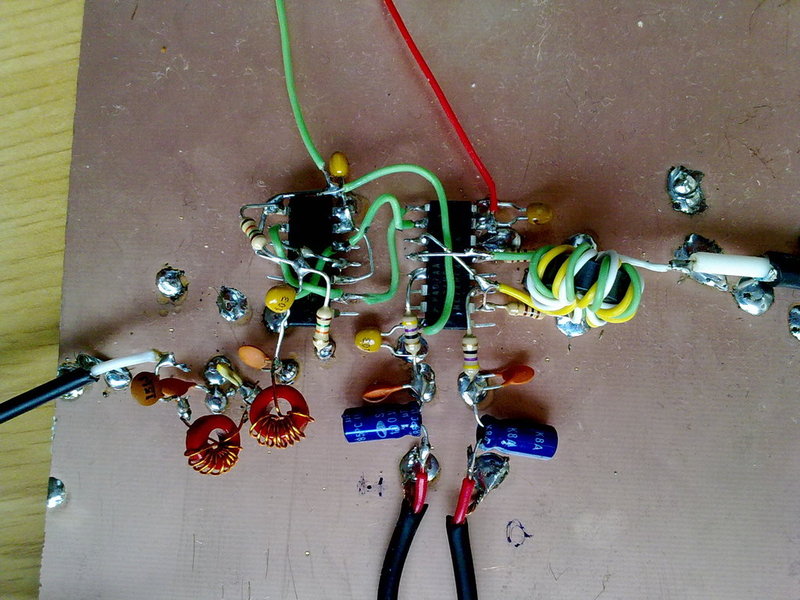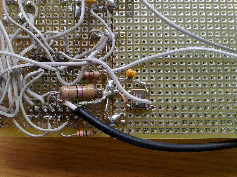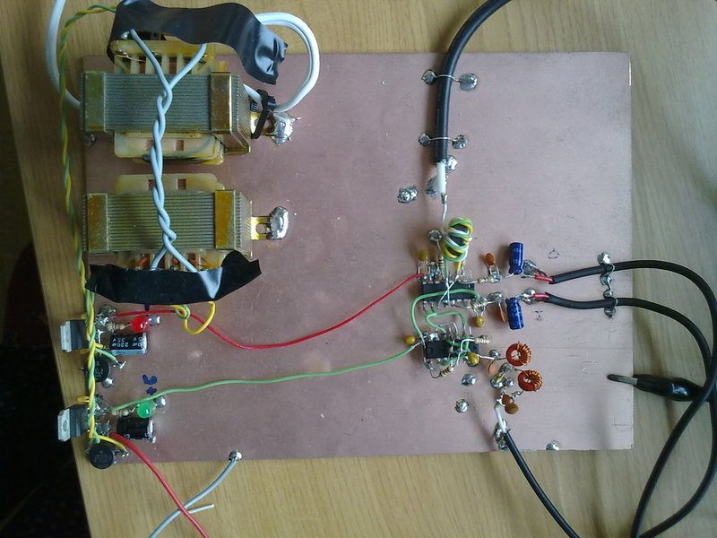 A simple prototipe is been built on a virgin copper board, using "ugly construction method". It includes +-5V dual polarity power supply. We are using an old AD9850 DDS chip just to test the mixer. There is not RF preamplifier neither RF filter at this stage.