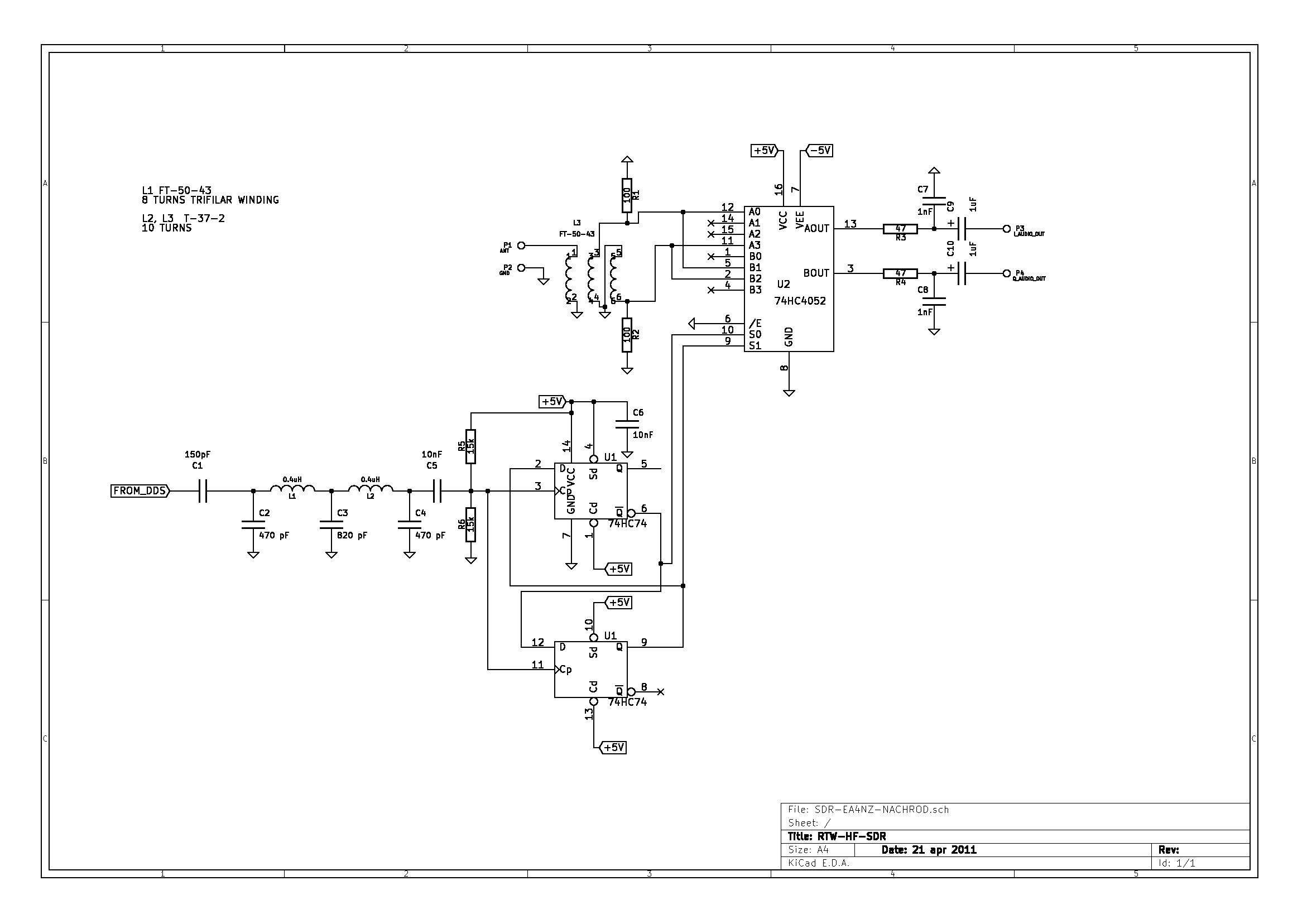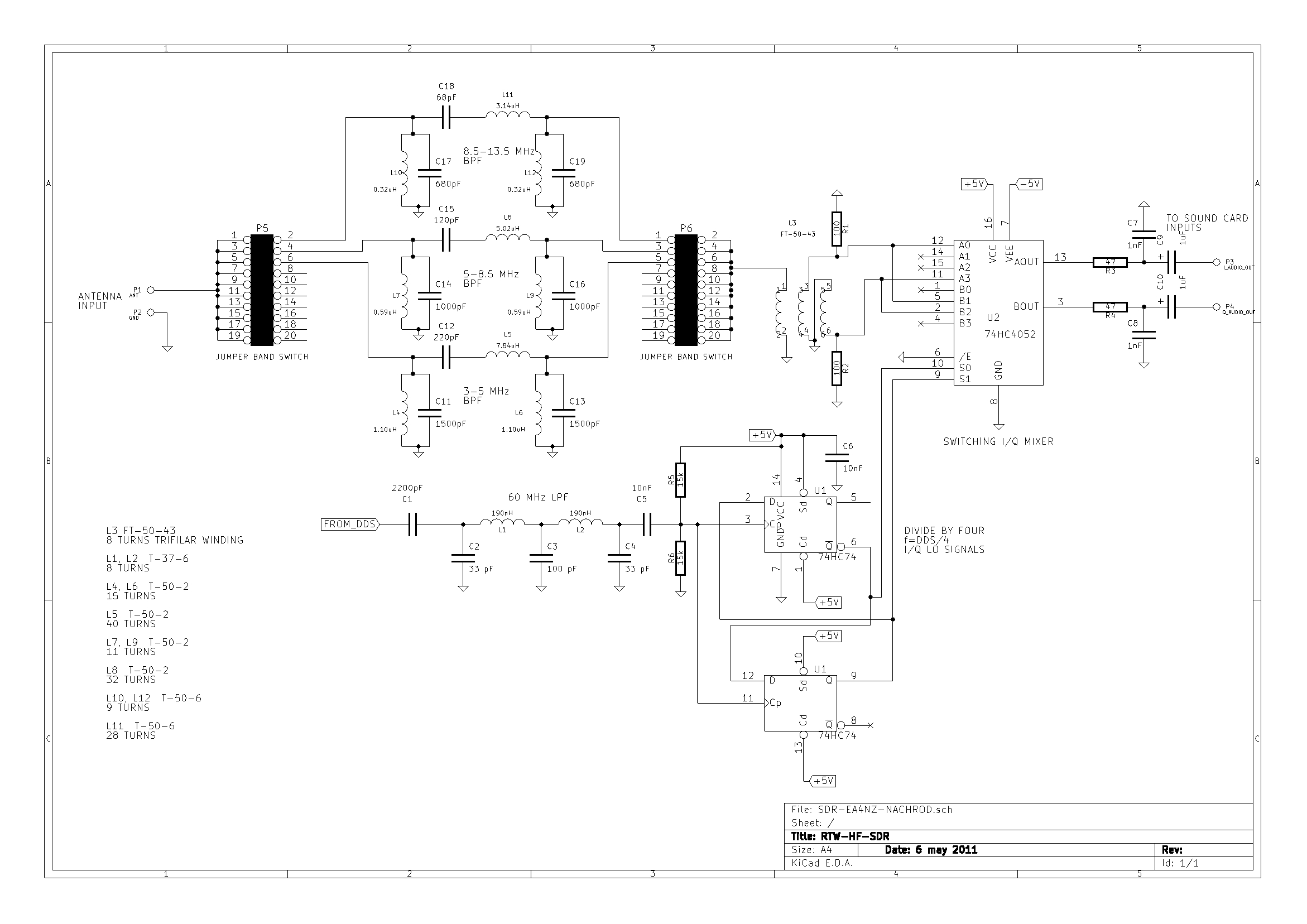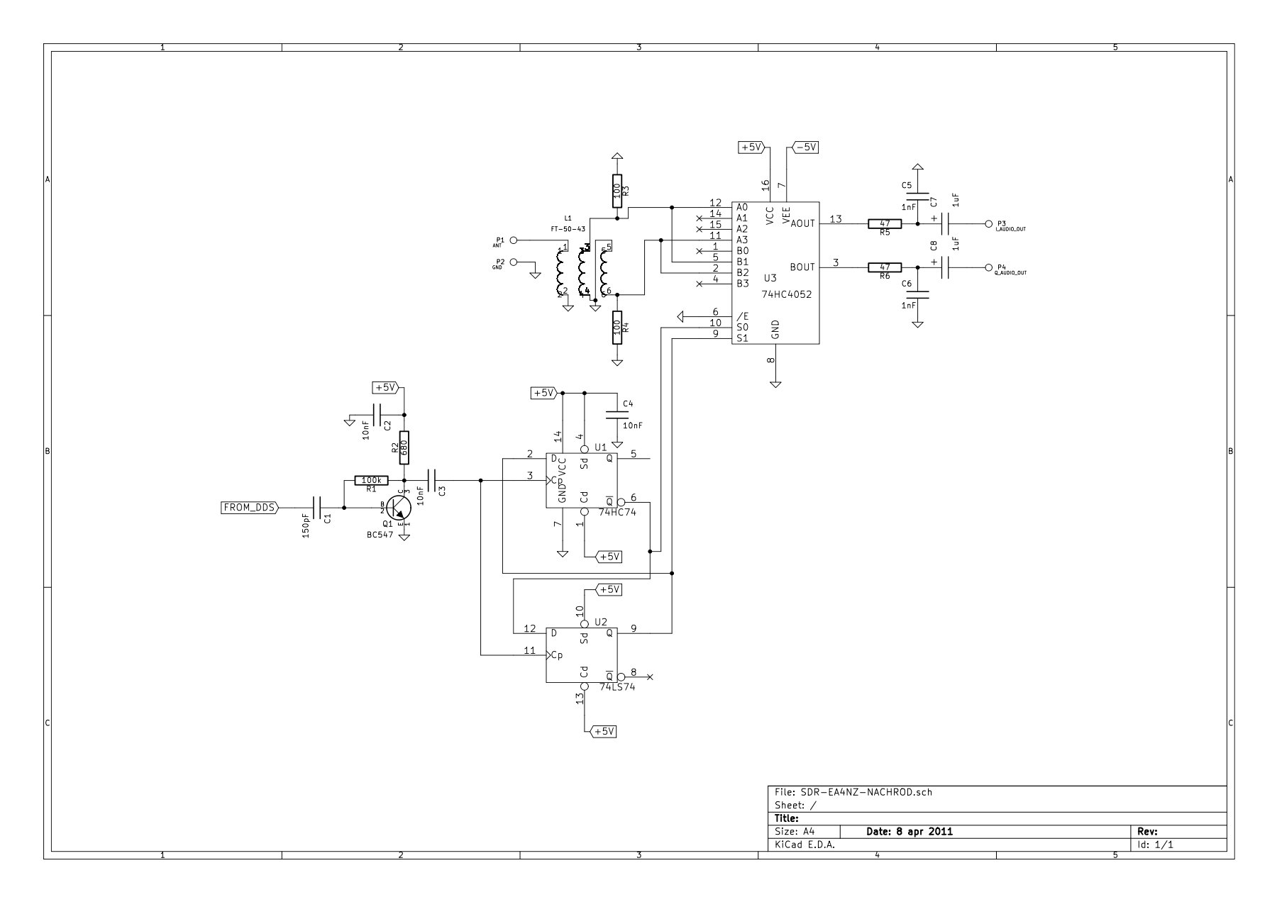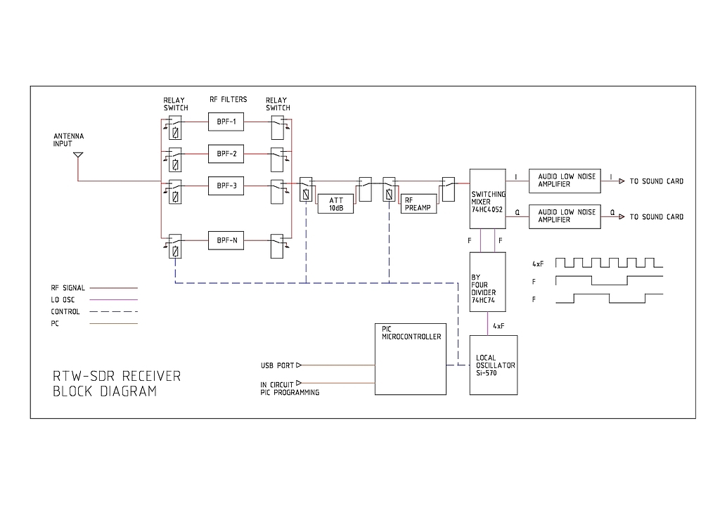 74HC74 by four divider idea has been learnt from several WEBs on the internet. It is a well proved design. Softrock and ZetaSDR designs and others where studied: http://www.qrz.lt/ly1gp/SDR/ http://www.wb5rvz.com/sdr/sr_lite_ii/ The idea is simple. LO oscilator signal is divided by four using flipflops. Both outputs are 90 deg out of phase. The signals control the switching mixer trough its four positions.