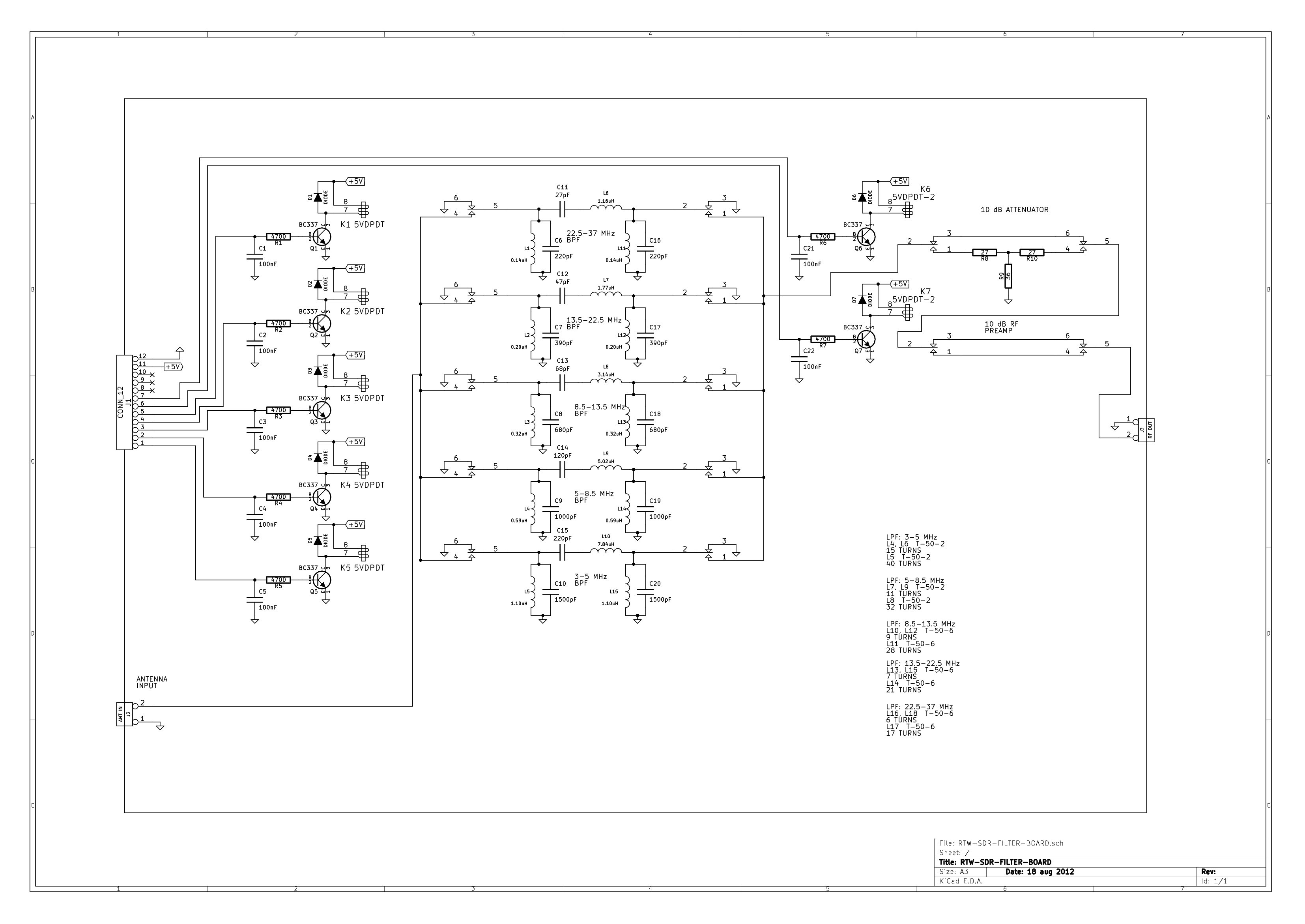 - Filter board. Includes the RF filters, switches, attenuator and RF amplifier. Only the filters are tested, switching elements are not built yet, perhaps in the future they will be substituted by diodes or transistors.