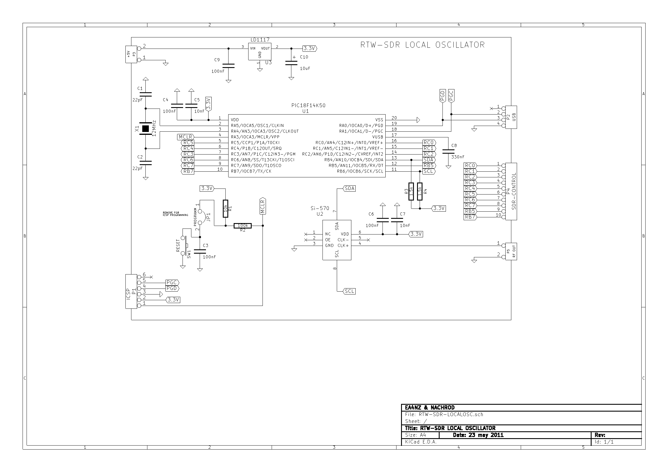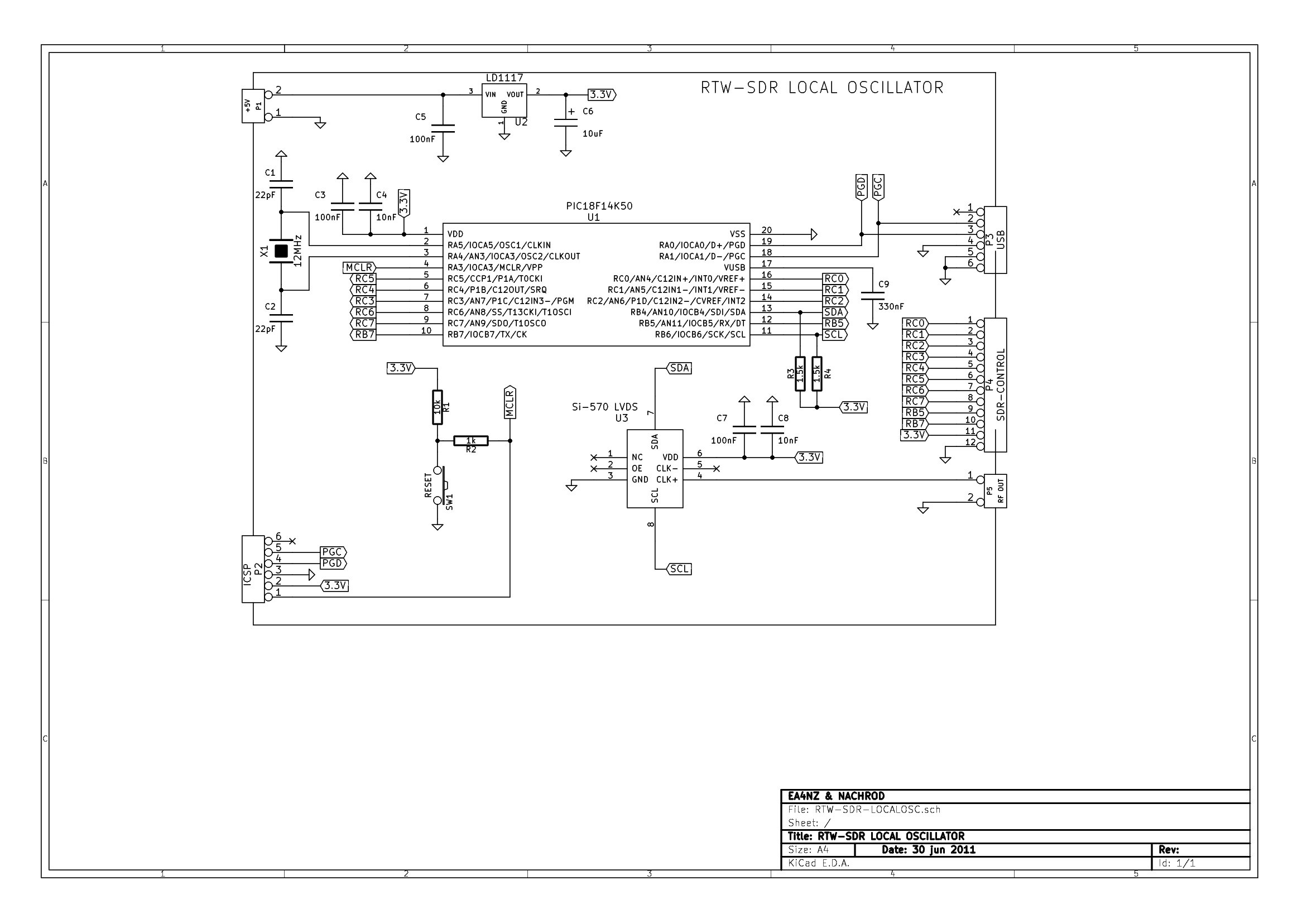 - Local oscillator board. It contains the PIC 18F14K50 Microchip microcontroller, Si-570 generator and USB connector