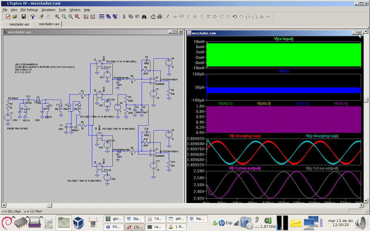 The mixer was simulated using LTSPICE (http://www.linear.com/designtools/software/#LTspice). This software is very fast compared to QUCS in transient simulations. So from now I use QUCS for AC and Sparameter simulation and RF filter design. LTCPICE is my preferred tool for transient simulations. LTSPICE runs perfectly under WINE on Linux.QUCS is a powerful tool where you need to include equations.