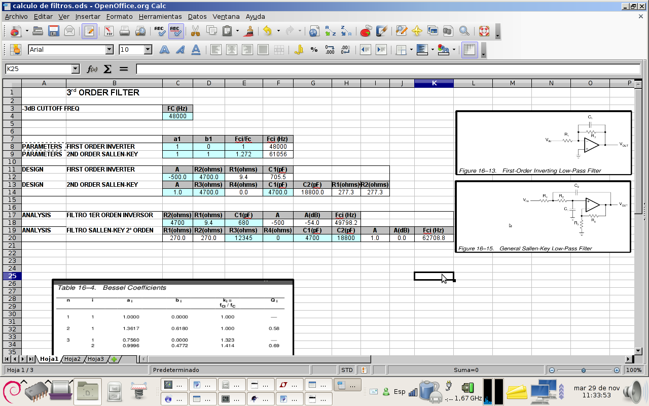 First order and second order Sallen-key filters were calculated using a Libreoffice spreadsheet that was designed using the book Operational Amplifiers For Everyone by Texas Instruments: