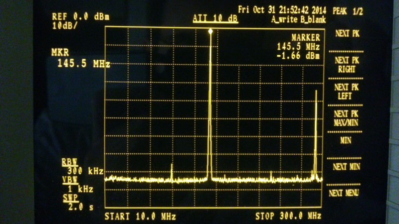 FIGURE 1: 145 MHz SIGNAL. 10MHz-300MHz SWEEP SHOWING MAIN SIGNAL, SECOND HARMONIC AND SOME SPURS