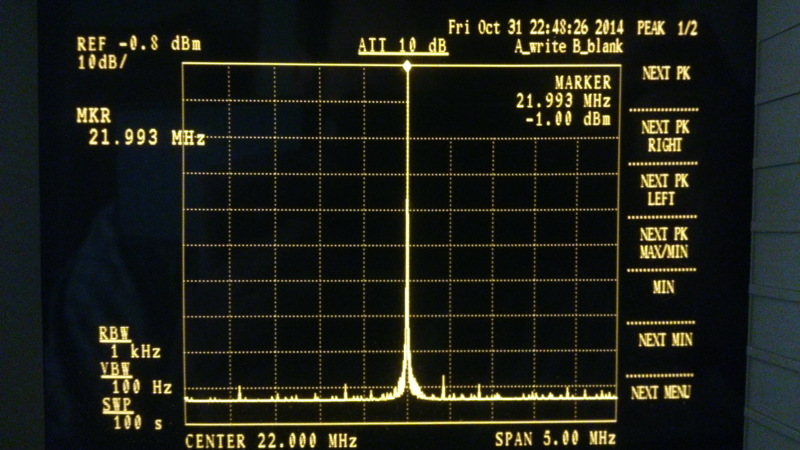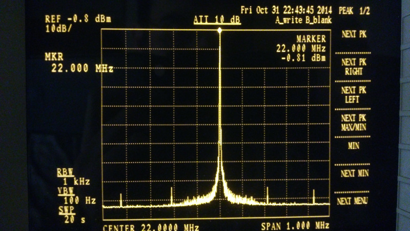 FIGURE 5: 22 MHz SIGNAL. 1MHz SPAN. FOUR SPURS ARE VISIBLE