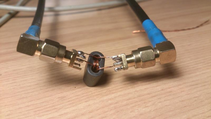 FIGURE1: 1:1 BIFILAR TRANSFORMER DURING S11 AND S21 TEST USING A VNWA3 NETWORK ANALYZER.