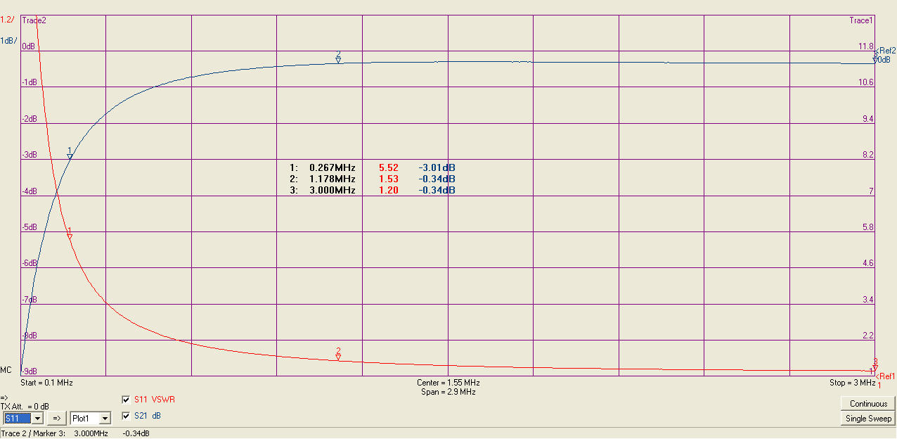 Now a detailed picture at low frequencies, sweeping from 100 kHz to 3 MHz: